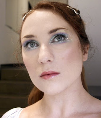 I used Platinum all over my lid, with a little wing" on the outer corner. Thenn I continued upwards with a rainbow of Clear Sky blue (matte light blue), a bright pink from the Zoeva palette (see below) and Banana Mochi, a summery yellow. With white kohl I added some definition to the "fish tail", and then repeated the same pattern on my lower lid (but only with blue and pink, no yellow this time). I glued on some rhinestones (1 heart-shaped on in the inner corners,1 bigger and 4 smaller ones in the outer corners) with Duo glue, and lined the upper lid in black. The lower waterline is done in white using Maybelline Expression kohl. The lashes are from the ballet store in Miami as well, the brand's name is "Dancer Only" (the packaging has a pair of pink pointe shoes on it ♥). On my cheeks I am wearing Terra del Sol #7 on my cheekbones, and Dollymix applied with the #187 on my cheeks, and the lipstick is Costa Chic with a bit of Shimmering Viola lipgloss in the middle and on the rims of my lips.